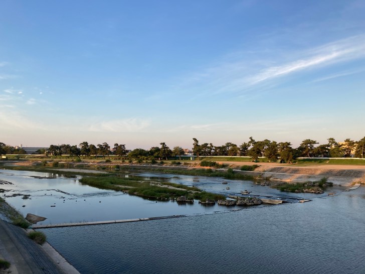 大きな川を渡る区切り感が心地いい。河川敷ではランナーやウォーカーも多く、朝の活気をもらえます。